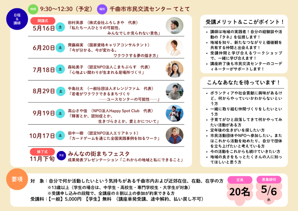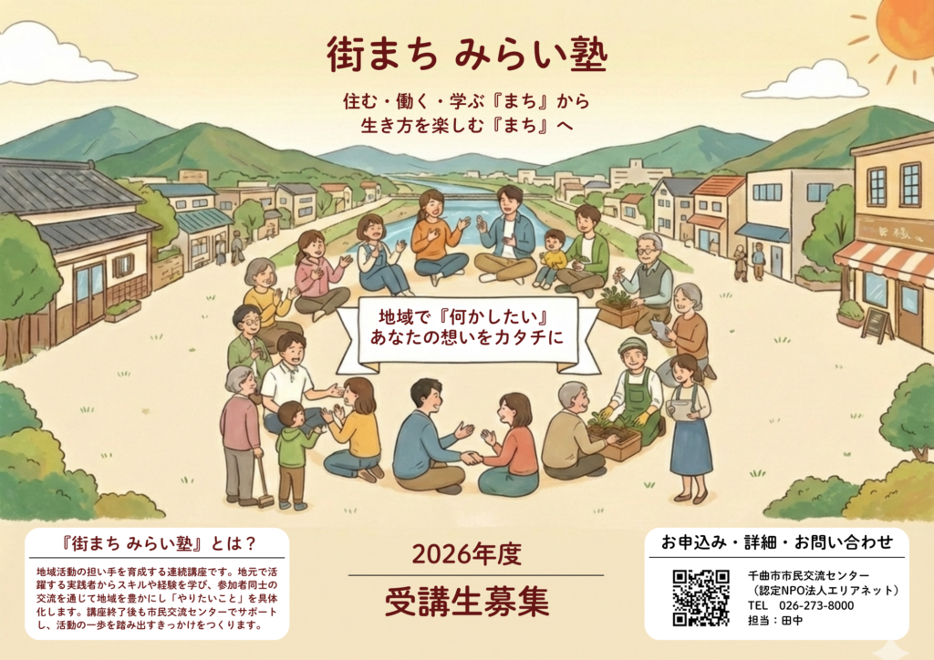 千曲市内または近郊に在住・在勤・在学する人々にとって、自分や周りの人を豊かにしていくようなこれからの人生の生きがいを見つけ、生き方を楽しむことができる『地域』や『まち』となるように。そして誰もがその地域で活躍できる活動者の育成となるような、連続したカリキュラムを2026年度約半年に渡り開講します。
