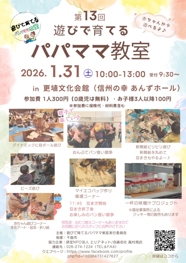 おんぶでパン食い競争、段ボール遊び、ビーズ遊び、新聞紙ビリビリ遊びと豆まき、エコバッグ作り、赤ちゃん遊びコーナー、一杯の味噌汁プロジェクト等が楽しめるよ♪