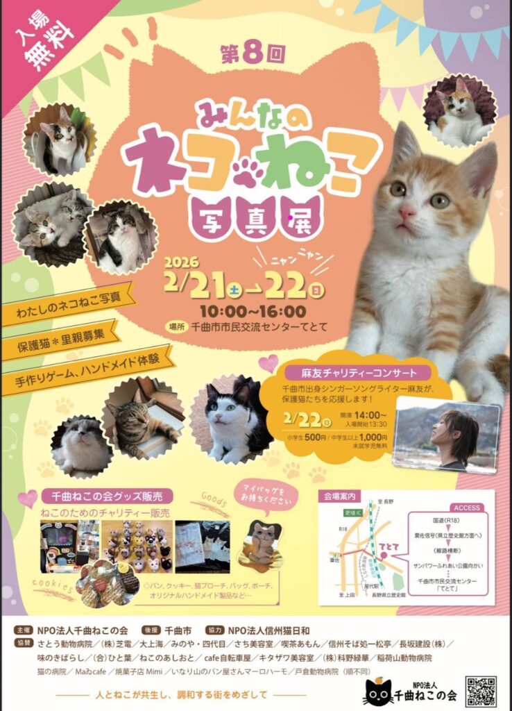 ①飼い猫・地域猫の写真展、千曲ねこの会活動発表、啓発パネル展示、猫のためのチャリティ販売